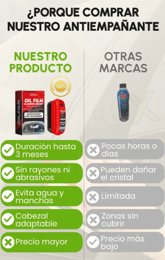 Elimina la película aceitosa y las manchas de agua en minutos, sin rayar el vidrio.